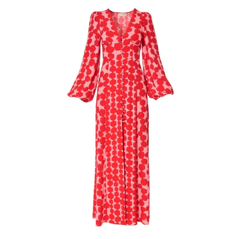 Maxi dress made of viscose crepe in a modern pattern combining the shade of pink with poppy, vivid red. Very long, voluminous sleeves with a puff gathered with an elastic band at the wrist allowing the possibility of lifting it up The deep, sensual neckline emphasizes the bust line. Strongly marked waist at the back wrinkled with numerous small elastic bands. Fastened with small, covered buttons with loops. High slit at the front. Wear eye-catching jewellery and high-heeled mules to create an elegant evening look in the style of the 70s or wear it with flat sandals for a holiday, summer boho style outfit.